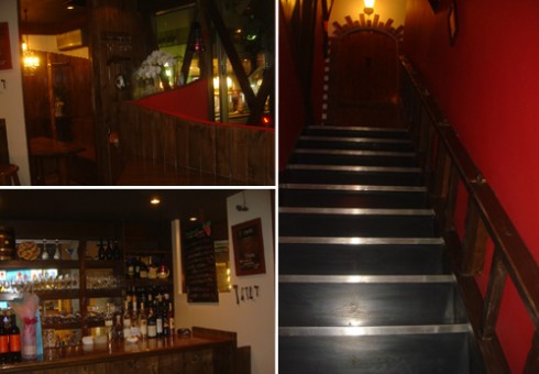 文字通り入り口階段の手摺に古いはしごを利用し、壁をワインレッドにするなど店主のアイディアを活かした本格ワインバー。店内は木目調で薄暗く調光しアクセントに流木を使用。